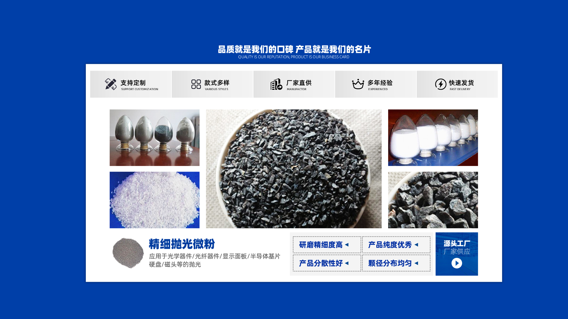 18年來,雙岳磨料經(jīng)過不斷發(fā)展和技術(shù)的積累,凝聚了 一批經(jīng)驗豐富,素質(zhì)精良的專業(yè)人才。我們始終堅持“客 戶為本”原則發(fā)展,以誠信經(jīng)營為基礎(chǔ),以服務(wù)滿意為保 證,歡迎新老客戶來廠洽談業(yè)務(wù)。